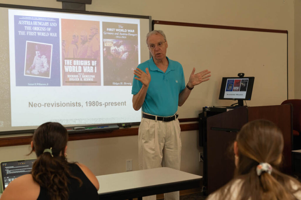 category: Faculty Emeriti - In Honor Of David Yelton By Office of University Communications On August 24, 2022 Professor Emeritus of History Dr. David Yelton On the last day of class in History 331, Gardner-Webb Professor of History Dr. David Yelton handed each student a thank-you note. Mostly history majors, they had given him a retirement party the week before. This personal gesture spoke volumes about his character and passion to mentor and teach during his 35 years at the University. “I will say that nothing is more meaningful to me as a professor than having a student express their appreciation for my efforts to help them grow in knowledge, ability and confidence,” Yelton shared. “That’s why I’ve spent some 92 semesters in higher education.” Whether helping students in Western Civilization to see the benefit of the general education course or guiding history majors to further develop their research, communication and critical-thinking skills, Yelton’s goal was the same. He endeavored to inspire and challenge his students to achieve success as undergraduates and take those skills into their career or graduate school. At his retirement in 2025, Yelton was named Professor Emeritus of History for his years of service and contributions to Gardner-Webb and his accomplishments as a scholar and historian. When the announcement was made, the faculty responded with a standing ovation. “That was as much of a reward that I could have asked for—they were essentially saying you did a good job,” Yelton said, his voice heavy with emotion. “Coming from your colleagues, it makes all the struggles along the way worth it.” Yelton, a native of Rutherford County, N.C., applied for a position at Gardner-Webb in 1990. It was a one-year commitment, but Yelton was asked to stay when Dr. Gil Blackburn moved from the Department of Social Sciences into the role of the dean of Academic Affairs. He appreciated Blackburn’s commitment to the academic reputation of Gardner-Webb. Other former colleagues in the department that influenced him were Dr. Barry Hambright and Dr. Tony Eastman for their ideals and their knowledge of Gardner-Webb policies. “I’ve had the pleasure of working with so many colleagues, both in my department and across campus, who show, and have shown, such dedication to the most admirable ideals of higher education,” Yelton noted. “I’ve also had so many wonderful students who showed a similar commitment to learning and benefitting from their time at Gardner-Webb.” Yelton established himself as a faculty leader, serving as coordinator for Secondary Social Studies Teacher Licensure from 1992 to 2012, (a job he said he wasn’t qualified to do) department chair from 2002-07, faculty chair from 2007-09, and assistant provost for Arts & Sciences from 2016 to 2020. His contributions to the Department of Social Sciences and the University include starting the research and methods course in History (HIST 200: Introduction to Historical Study). Yelton also took an instrumental role in the creation of the Academic Honesty Policy, which laid the foundation for the Honor Code, later developed by others. Specifically, he helped develop the system by which the University would have a mechanism to track, identify, and punish repeat offenders. In addition, Yelton was part of the group that designed the Professional Readiness Experience and served on the committee that established the Information Literacy Requirement. “Gardner-Webb is a special place because of its people and their dedication to the basic mission of the school—to serve God and humanity through higher education,” Yelton affirmed. “It’s been an honor to be a part of that.” Yelton’s interest in studying Germany and World War II began in his youth. “The 1960s popular culture was thoroughly infused with information about the second World War,” Yelton reflected. “As much of it was from the American perspective, I developed a curiosity about the other side, particularly the Germans. My father was in the National Guard until I was about 9 or 10, and I was therefore curious about military issues.” As a student at Appalachian, Yelton encountered Dr. Rennie Brantz, “who naturally exuded a love for history.” Brantz inspired him to become a college professor and further developed Yelton’s fascination with German history. After earning his bachelor’s in history from Appalachian State, Yelton received his master’s (1985) and PhD (1990) from the University of North Carolina at Chapel Hill. His primary academic field was modern European history with focus on 20th Century Germany. Yelton remained an active scholar in the field of German history and well-known for his research on the German Volkssturm, a militia organization founded in the fall of 1944 and formed by the Nazi Party. His research has been published in journals, volumes and encyclopedias and has become the accepted interpretation of both the Volkssturm and the broader Nazi war-fighting strategy. He is the author of two books, “Hitler’s Volkssturm: The Nazi Militia and the Fall of Germany 1944-45” (University Press of Kansas, 2002) and “Hitler’s Home Guard: Volkssturmman, Western Front, 1944–1945” (Osprey Publishing, 2006). He was especially interested in examining the citizen militia of Nazi Germany. “I selected it as a dissertation topic because at that time it had never been thoroughly studied,” Yelton offered. “Once I began researching the topic, I found that there had been little work in English on the German perspective of the end of the war. Interestingly, I finished my dissertation in 1990. The Germanies reunified the next year, which meant that there was a lot of archival material now available that had previously been closed. In 1996, I received a Gardner-Webb sabbatical that let me investigate enough of the former East German archival material to confirm that I didn’t have to revise my conclusions fund
